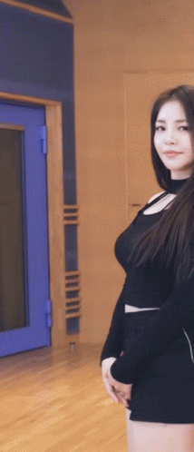 ຄຳອະທິບາຍເນື້ອຫາ: a woman in a black crop top and shorts is standing in a room .