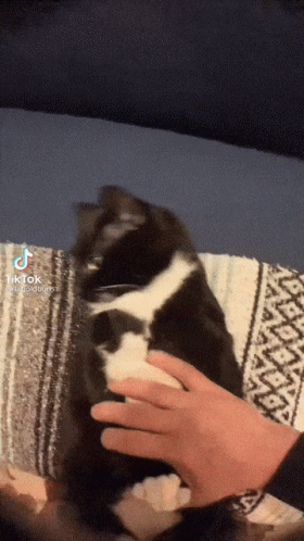 ຄຳອະທິບາຍເນື້ອຫາ: a black and white cat is being petted by a person on a tiktok video