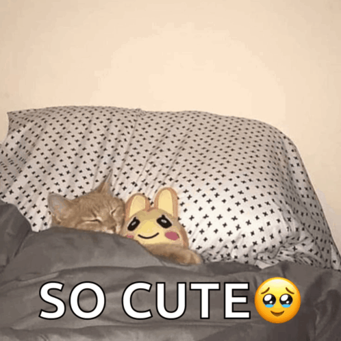 ຄຳອະທິບາຍເນື້ອຫາ: a cat and a stuffed animal are sleeping on a bed with the words so cute above them