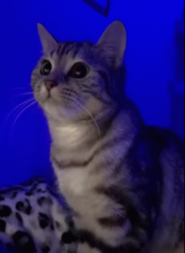 ຄຳອະທິບາຍເນື້ອຫາ: a cat is sitting in front of a blue background and looking up at the camera .