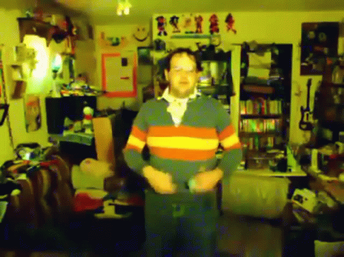 ຄຳອະທິບາຍເນື້ອຫາ: a man in a striped shirt is standing in a cluttered room with chinese characters on the wall