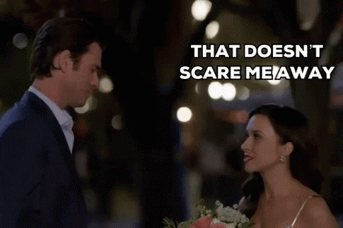 ຄຳອະທິບາຍເນື້ອຫາ: a man and a woman are looking at each other with the words that does n't scare me away behind them