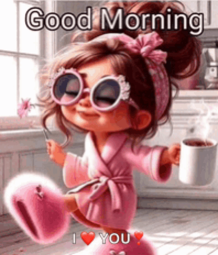 ຄຳອະທິບາຍເນື້ອຫາ: a cartoon girl in a pink robe is holding a cup of coffee and a flower .