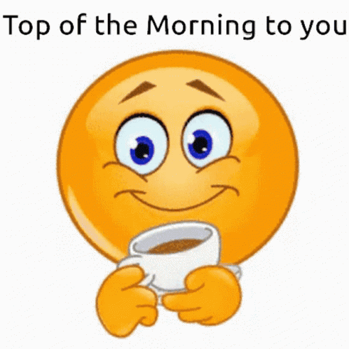 ຄຳອະທິບາຍເນື້ອຫາ: a smiley face is holding a cup of coffee and saying top of the morning to you .
