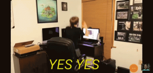 ຄຳອະທິບາຍເນື້ອຫາ: a man sits at a desk with a computer and the words yes yes on the screen