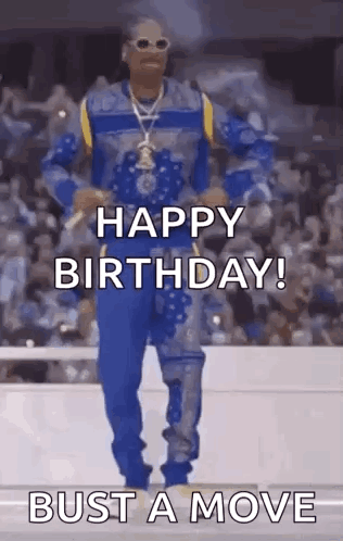 ຄຳອະທິບາຍເນື້ອຫາ: snoop dogg is dancing in front of a crowd and says `` happy birthday ! bust a move ''