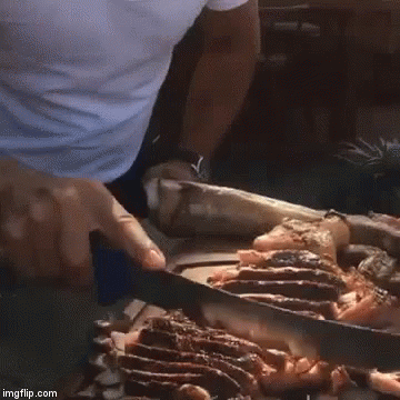 ຄຳອະທິບາຍເນື້ອຫາ: a person is cutting a piece of meat on a wooden cutting board .