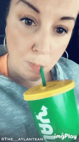 ຄຳອະທິບາຍເນື້ອຫາ: a woman drinking from a green cup that says subway