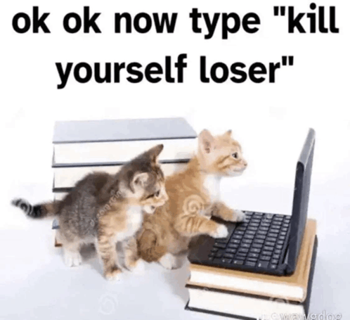 Turinio aprašas: two kittens standing next to a laptop with the words " ok ok now type kill yourself loser "