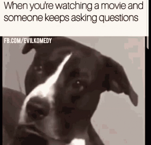 - Turinio aprašas: a picture of a dog with the words when you 're watching a movie and someone keeps asking questions on the bottom