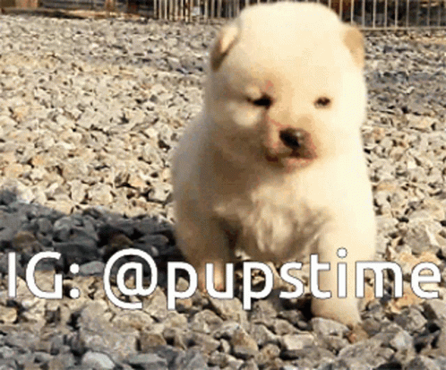 Turinio aprašas: a small white puppy is sitting on a pile of rocks with the hashtag @pupstime