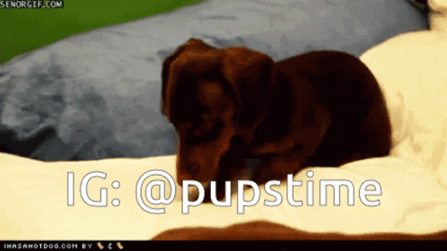 Turinio aprašas: a brown dog is laying on a bed with the words ig @pupstime below it