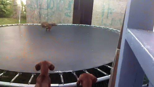 - Turinio aprašas: two dachshunds are jumping on a trampoline in front of a building with graffiti on it that says t.