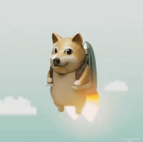 Turinio aprašas: a doge is flying through the air with a jetpack on its back .