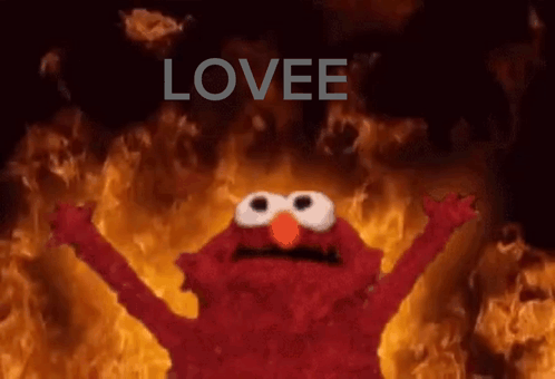 Turinio aprašas: elmo is standing in front of a fire with the word lovee written above him