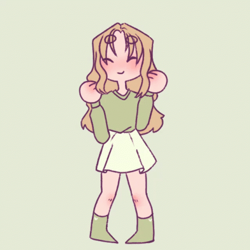 Turinio aprašas: a drawing of a girl wearing a green sweater and white skirt