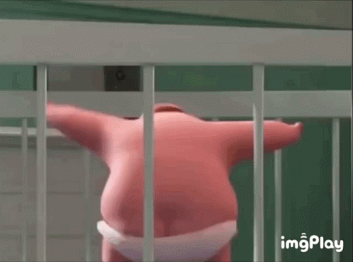 Turinio aprašas: a pink stuffed animal is standing in a cage behind bars .