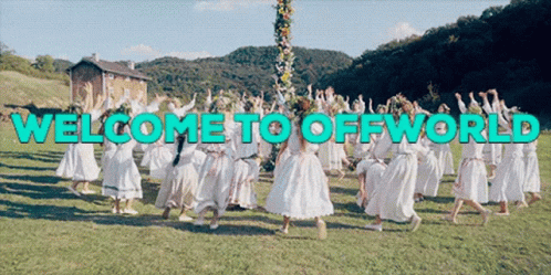 - Turinio aprašas: a group of women in white dresses are dancing in a field with the words welcome to offworld below them