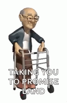 Turinio aprašas: a cartoon of an elderly man using a walker and saying `` taking you to promise land '' .