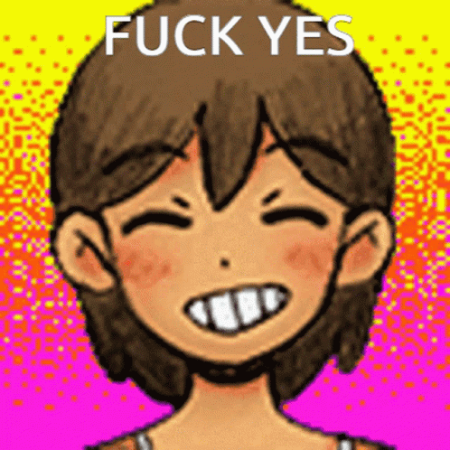 Turinio aprašas: a cartoon girl is smiling with the words fuck yes written above her