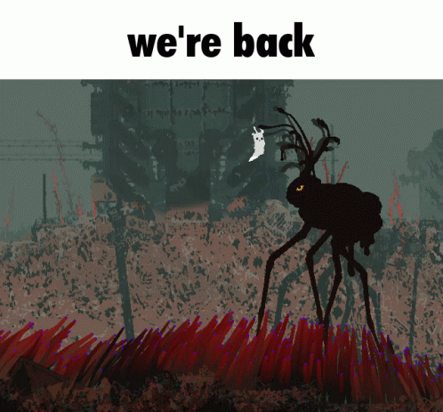 Turinio aprašas: a drawing of a monster with the words we 're back