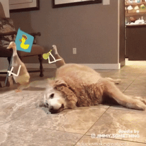 Satura apraksts: a dog laying on the floor next to a duck wearing a duck costume