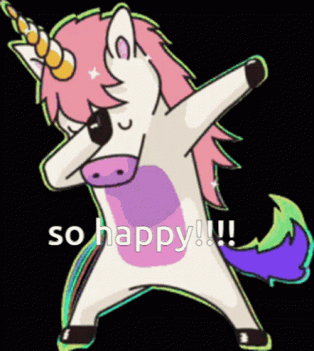 Satura apraksts: a unicorn is dabbling with the words so happy !!! below it
