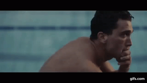 Контентын тайлбар: a shirtless man is sitting next to a swimming pool with his hand on his chin .