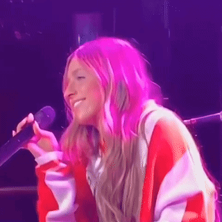 Контентын тайлбар: a woman with pink hair is singing into a microphone on a stage