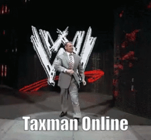 Контентын тайлбар: a man in a suit and tie is dancing in front of a w logo and the words taxman online