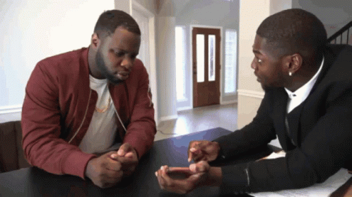 Контентын тайлбар: two men are sitting at a table looking at a phone