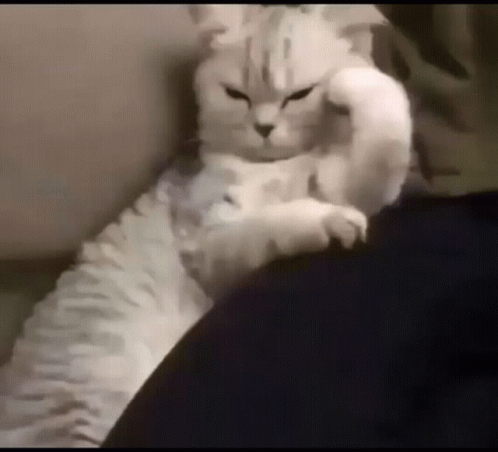Контентын тайлбар: a white cat is laying on a person 's lap and making a fist with its paw .