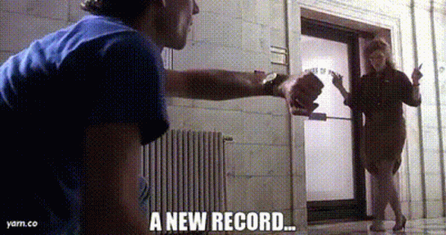 Контентын тайлбар: a man and a woman are standing in front of a door with the words `` a new record '' written on the bottom .