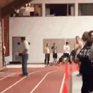 Контентын тайлбар: a group of people are standing on a track in a gym watching a person run .