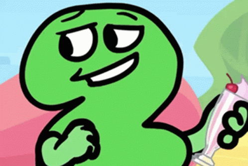 Контентын тайлбар: a green cartoon character holding a milkshake with a cherry in it