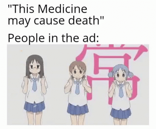 Контентын тайлбар: three anime girls are dancing in front of a sign that says this medicine may cause death people in the ad