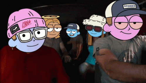 Контентын тайлбар: a group of cartoon characters with one wearing a hat that says stonks on it