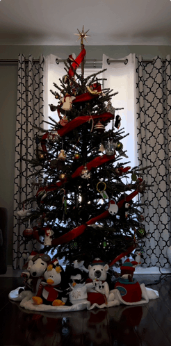 Контентын тайлбар: a black christmas tree with red ribbons and decorations