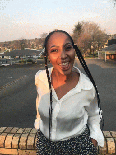 Контентын тайлбар: a woman wearing a white shirt and floral pants smiles in front of a parking lot