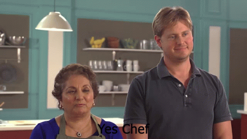 Контентын тайлбар: a man and a woman standing next to each other with the words yes chef on the bottom right
