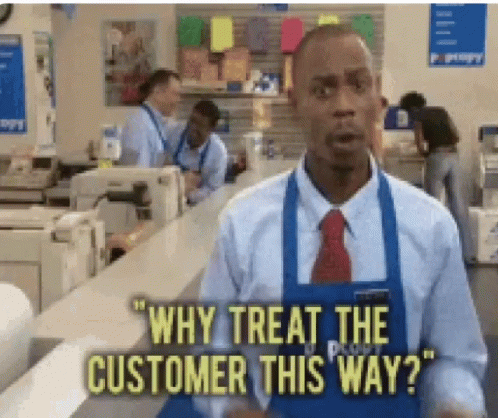 Контентын тайлбар: a man in a blue apron is talking to a customer and says " why treat the customer this way "