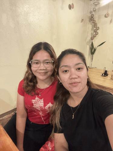 Контентын тайлбар: a woman wearing a red shirt with a maple leaf on it sits next to a woman wearing a black shirt