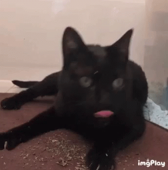 Контентын тайлбар: a black cat is laying on the floor with its tongue out and a piece of food in its mouth .