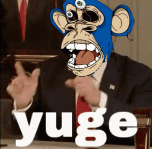 Контентын тайлбар: a man in a suit and tie has a monkey mask on his face and the word yuge in white letters behind him