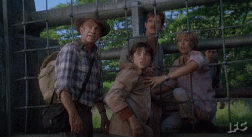 Контентын тайлбар: a man in a hat looks at a t-rex with the words zest [ cellphone ringing ] below him