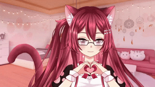Контентын тайлбар: a girl with red hair and cat ears is making a heart with her hands