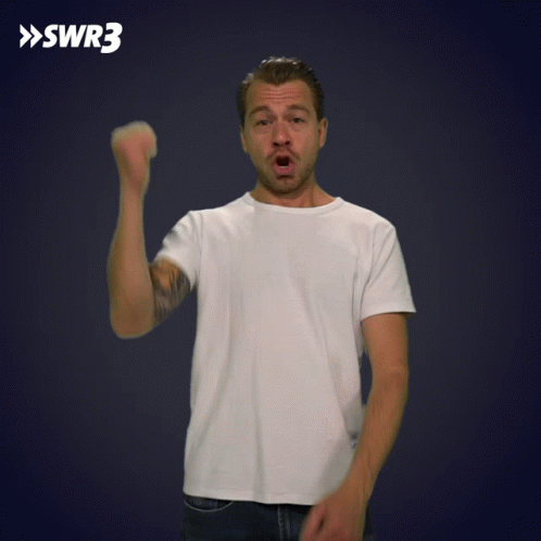 Контентын тайлбар: a man in a white shirt holds his fist up in front of a blue background with swr3 written on it