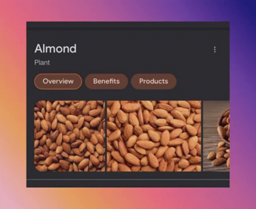 Контентын тайлбар: a screenshot of an almond plant with benefits and products buttons