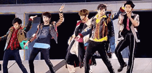 Контентын тайлбар: a group of men are standing next to each other on a stage and dancing .