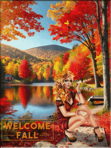Контентын тайлбар: a painting of a woman sitting in front of a lake with the words welcome fall